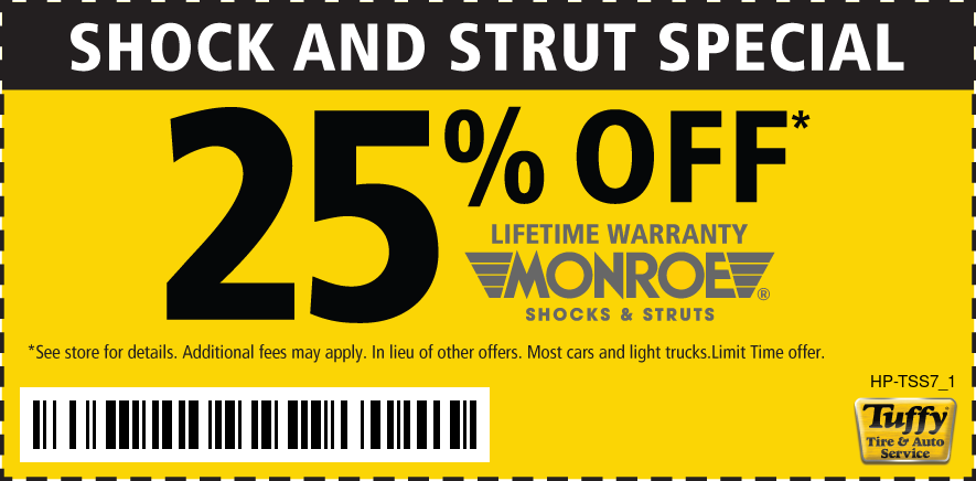 Good only atTuffy Romeo Expires 01/15/26 Request an Appointment Print coupon Share to Google Offer details Shock & Strut Special 25% OFF Lifetime Warranty * See coupon for exclusions. Email Coupon First name * Last name * Email address * Sign me up to receive future offers via text from Tuffy Romeo: Via Text Cell/Mobile Phone By clicking "I accept" below, I expressly agree to receive marketing text messages made by or on behalf of Tuffy Romeo to the telephone number(s) I’ve listed above. I understand that I may receive such text messages by the use of Automatic Telephone Dialing Systems (including “Predictive Dialers” or “Autodialers”) and I agree to receive them even if I have registered my number(s) with my state or federal Do-Not-Call list(s). I understand that such text messages will include advertising containing offers for goods or services and that I may revoke this consent at any time by telephone, return text message or by Visiting tuffyromeo.com/stop to unsubscribe. Message and data rates may apply. I also understand that I am NOT required to provide this consent as a condition of purchasing goods or services. I accept View: Text Specials Terms and Conditions with this link.